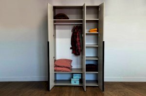 Шкаф имеет удобное наполнение: слева расположены полки для хранения вещей, а справа - штанга для вешалок. Это позволяет рационально использовать пространство и разместить различные типы одежды.